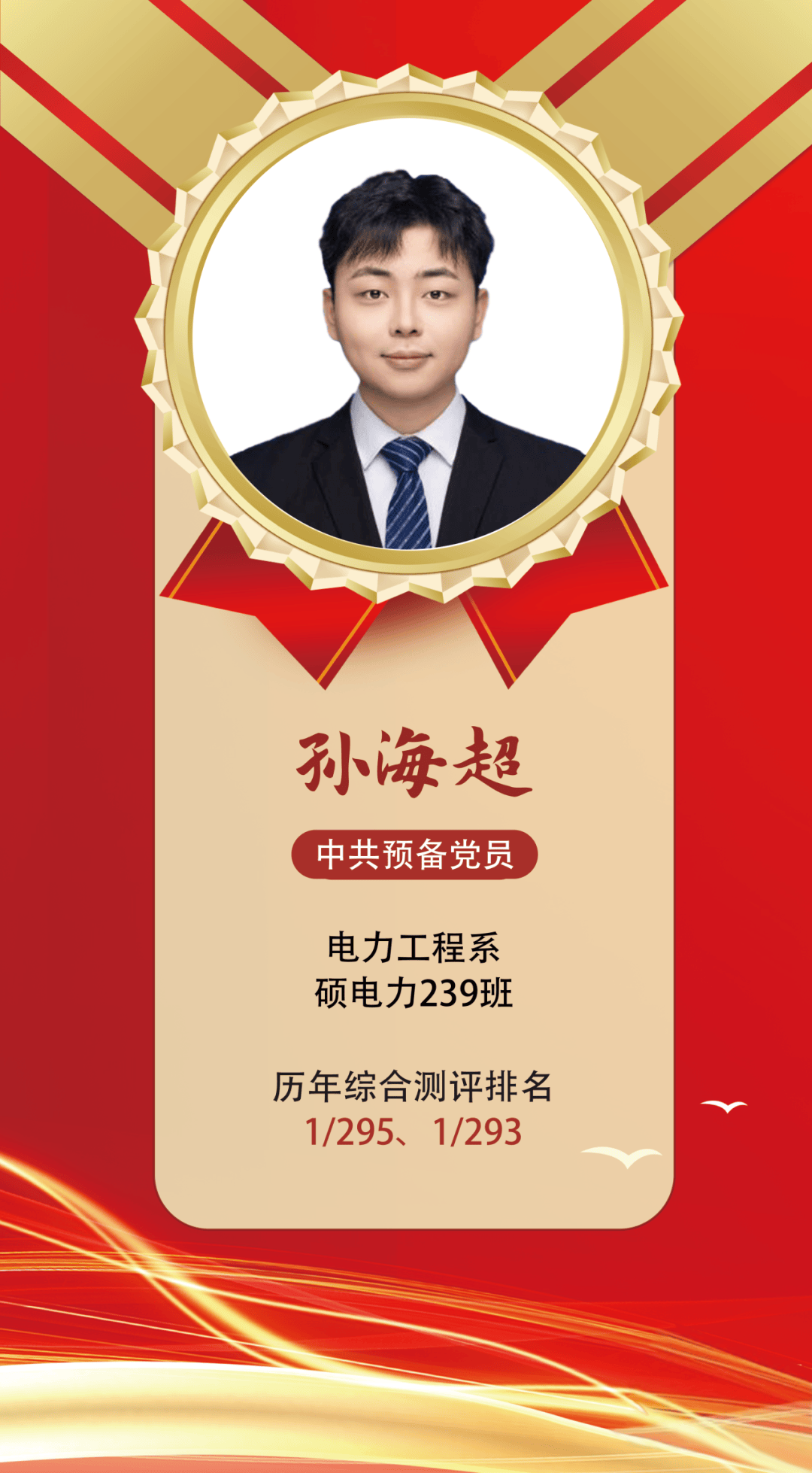 尹志强,动力工程系硕动力238班,党员。现任硕动力238班班长、硕动力第八党支部书记。综测排名第一,曾获国家奖学金,获评优秀研究生标兵、优秀学生干部等荣誉称号。硕士期间共发表SCI论文8篇,累计影响因子70.3,其中包括SCI一区论文4篇,以第一作者在SCI一区TOP期刊《Energy》与《Renewable Energy》发表论文2篇,以第二作者在《Energy Conversion and Management》发表论文1篇;另发表SCI二区论文4篇。参与国家自然科学基金1项、国家自然科学基金重大项目1项、北京市自然科学基金1项。他以身作则,以服务奉献践行初心使命,作为班长和党支部书记,关心关爱班级和支部同学,积极帮助同学们解决生活和学习上的困难;担任青年导师,主动分享成长经验,助力青年学子成长成才。